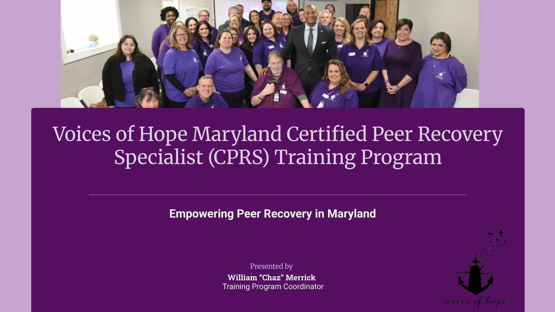 Voices of Hope, Inc. is offering the full curriculum, internships, exam preparation, and supervision to qualified individuals to become a Maryland Certified Peer Recovery Specialist (CPRS). This classification is viewed as the title for the peer recovery support worker primarily involved in providing recovery support services to individuals living with behavioral health disorders. This credential is governed by the Maryland Behavioral-health Professional Certification Board, as a consortium member of the International Certification & Reciprocity Consortium (IC&RC). This is a reciprocal credential offered at the international level. Peer Recovery Support Specialists are part of an evidence-based profession that improves outcomes of behavioral health treatment and interventions.